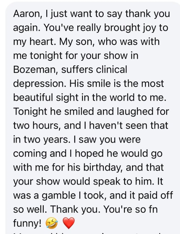 It’s mostly jokes… mostly. Growing up with a bipolar father and a schizophrenic older brother left Aaron Foster with a combination of survivor’s guilt, depression and anxiety that has invalidated his every accomplishment, destroyed his every relationship and invaded his every waking thought. A comedy!